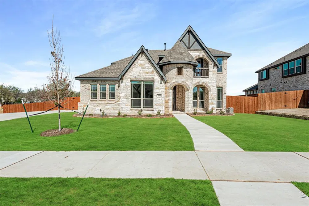 READY FOR MOVE IN. Located on a massive homesite almost 17,000 square feet! Bloomfield's Wisteria plan offers gorgeous curb appeal with a Juliet balcony on the storybook façade and an open interior layout packed with upgrades to add beauty & value! 4 spacious bedrooms - including a first-floor Primary Suite and second-floor In-Law Suite - and 3.5 baths. Plenty of flexible spaces including a Study and Game Room. HUGE Kitchen designed for gatherings with your loved ones has a center island, walls lined with cabinetry, built-in SS appliances, a wood vent hood, and granite surfaces! Additional counter and cabinet space from a Buffet and a Coffee Bar in the Breakfast Nook. The Stone-to-ceiling Fireplace can instantly be fired up and add ambiance. Amazing Primary features a sitting area, garden tub, separate shower, and separate vanities. This home has it all: a Tech Center, an Extended Covered Patio, Gutters, and a 2.5-car side swing garage with extra room for storage or a workspace. Visit Bloomfield at Triple Diamond to learn more!